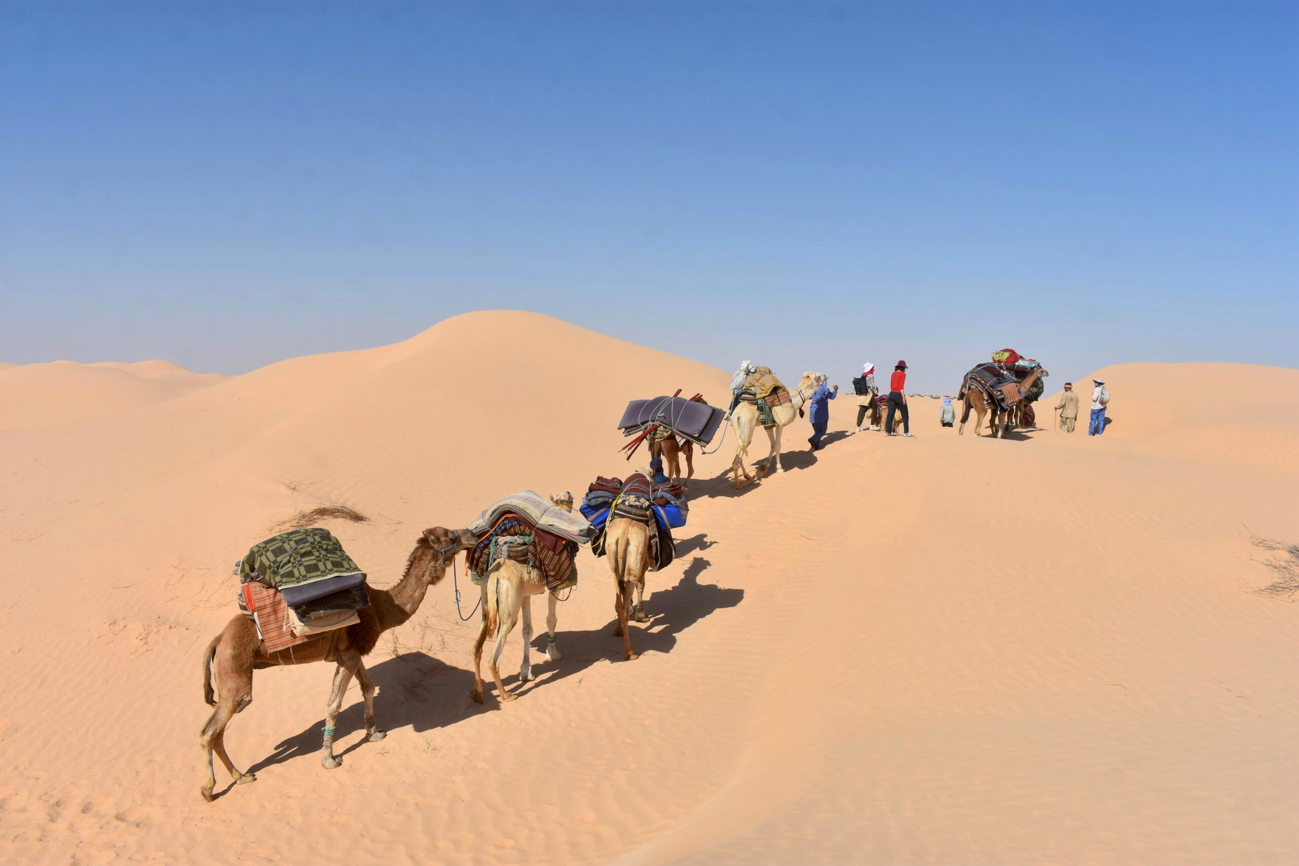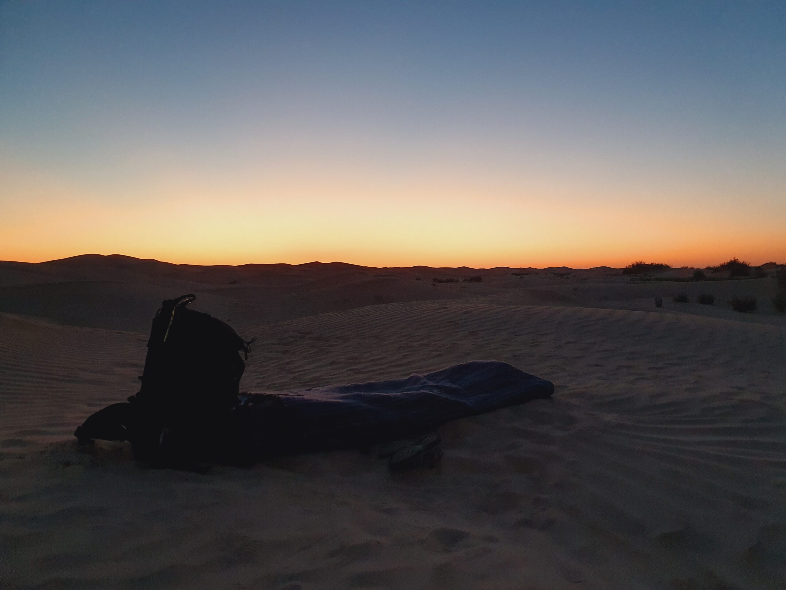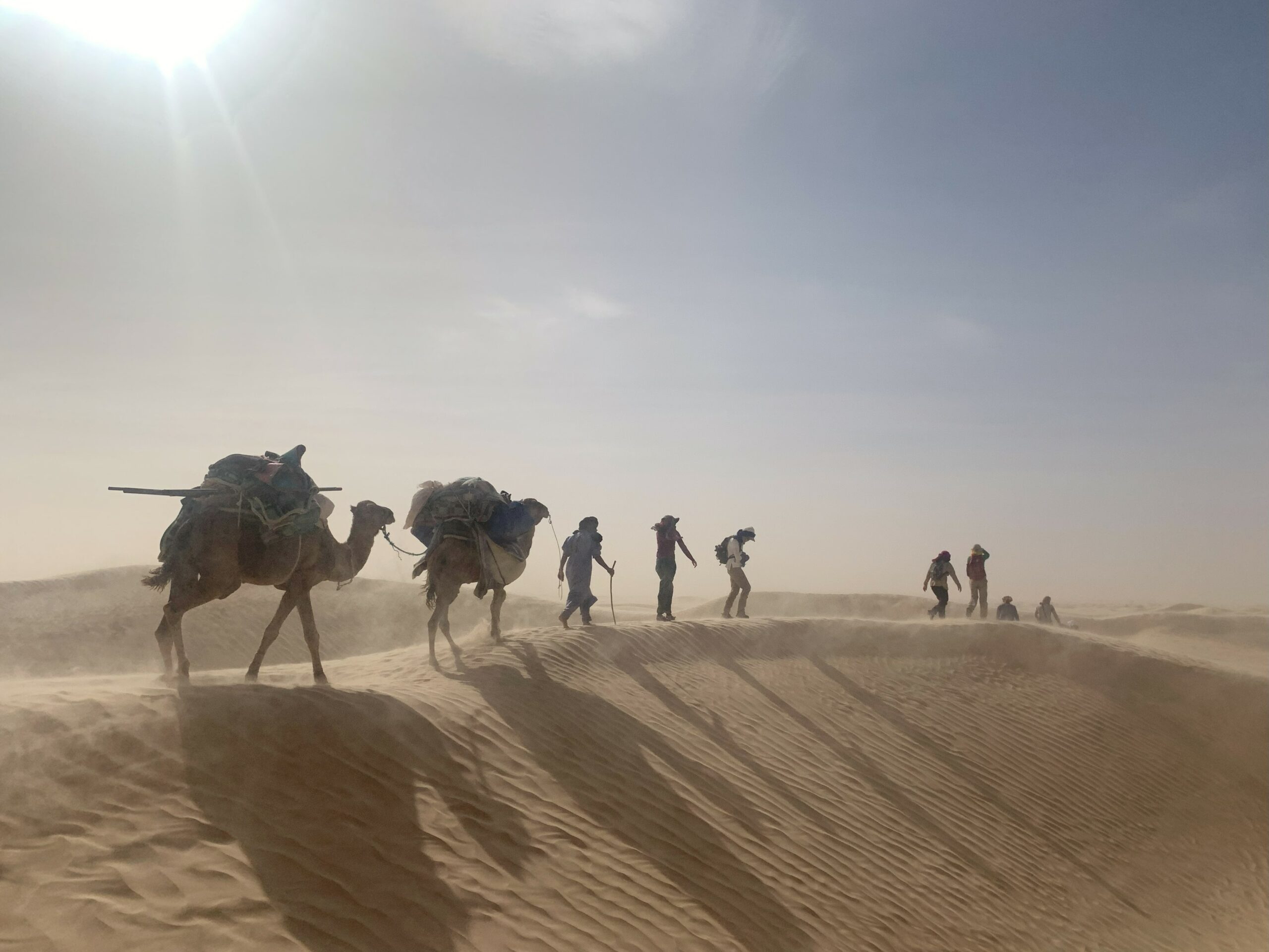 Réveillés par le soleil, nous marchons le matin (~3-4h) au rythme des dromadaires qui portent nos sacs, pieds nus dans le sable pour ceux qui le souhaitent.