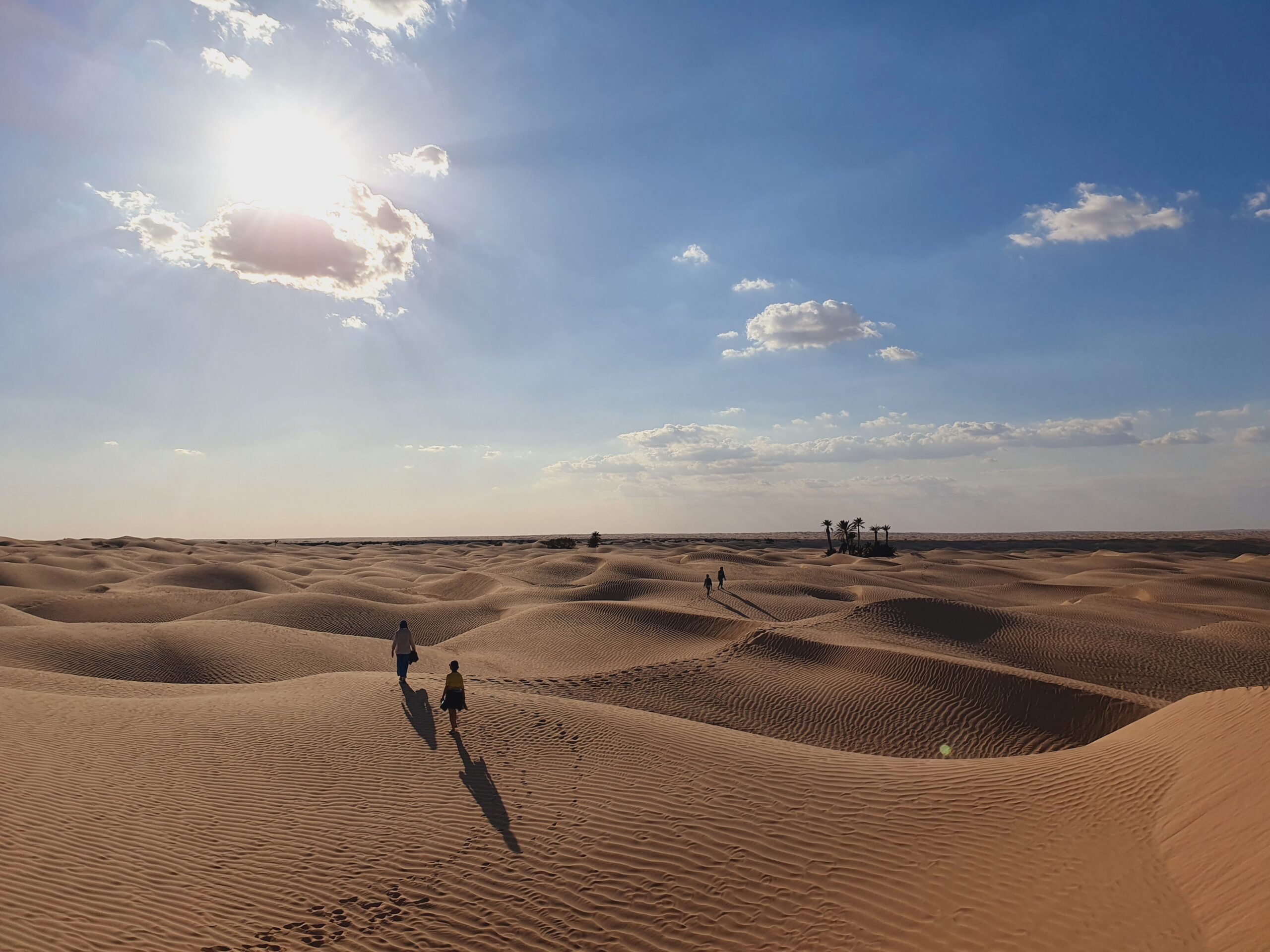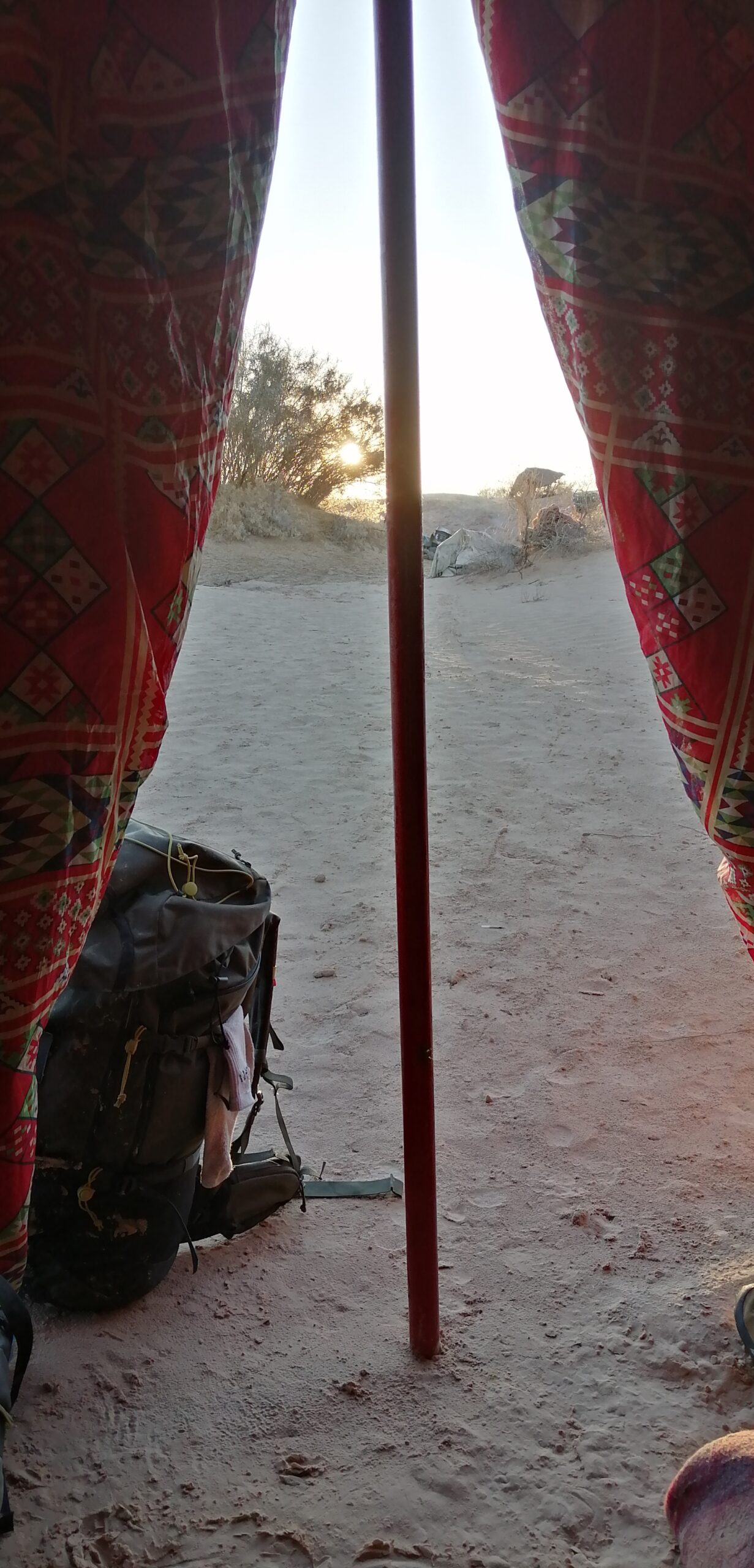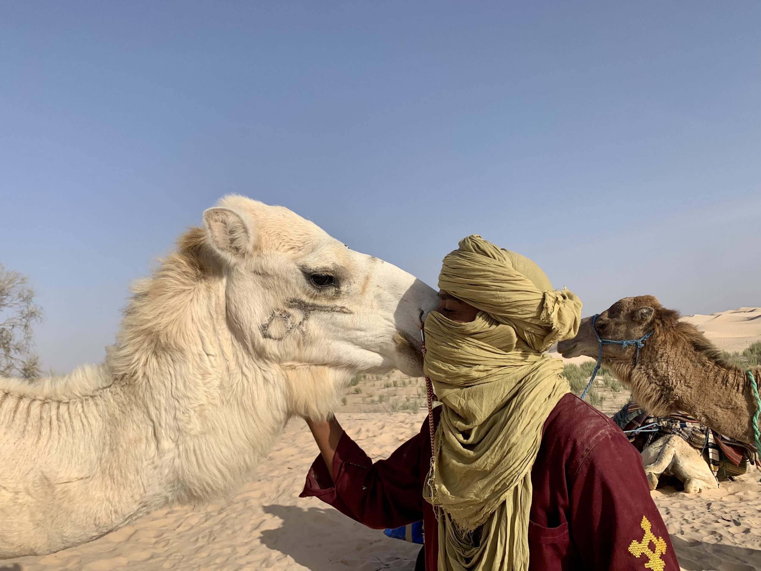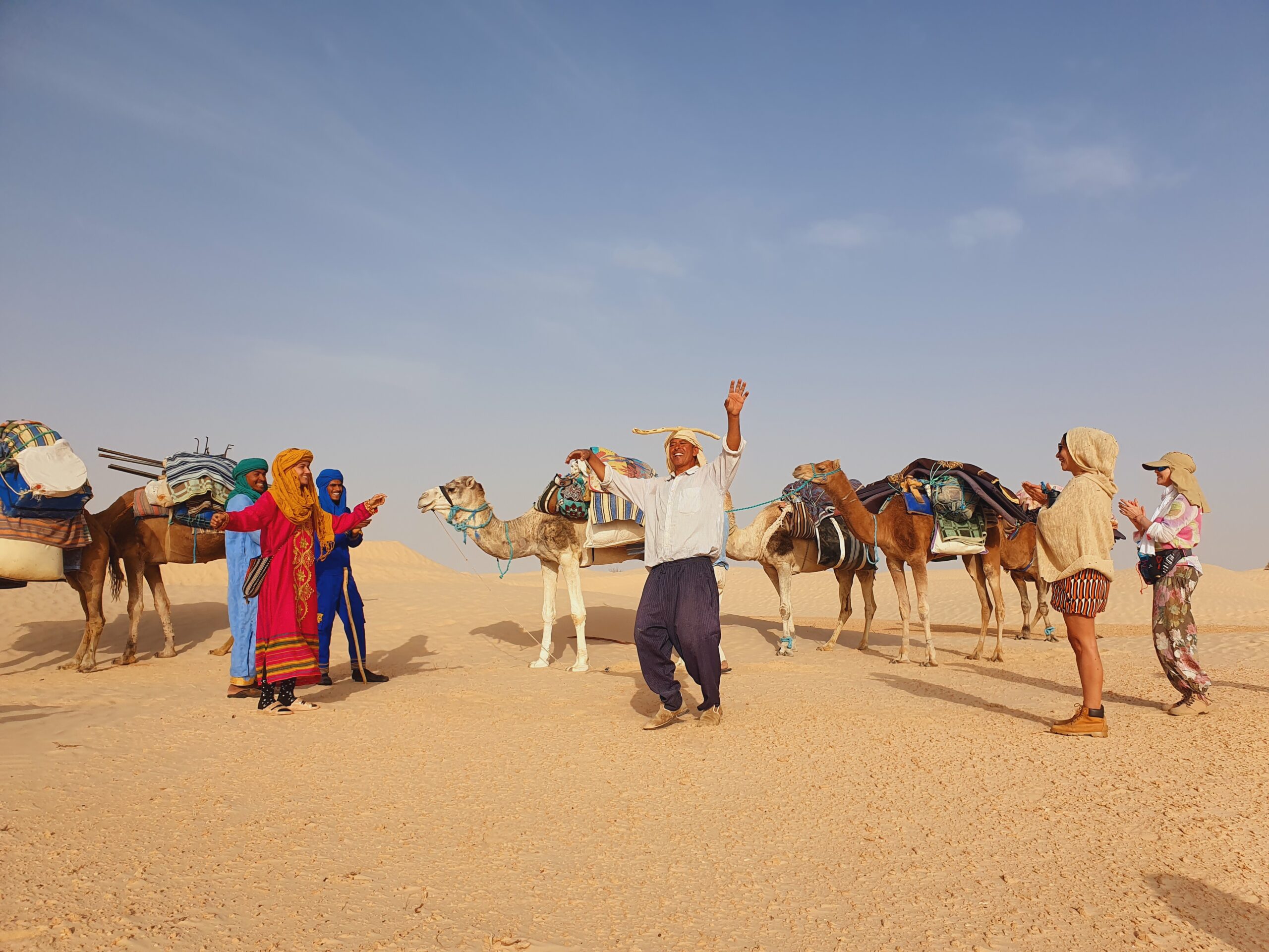 Réveillés par le soleil, nous marchons le matin (~3-4h) au rythme des dromadaires qui portent nos sacs, pieds nus dans le sable pour ceux qui le souhaitent.